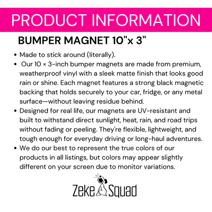 This 10x3-inch bumper magnet features the sweet, goofy face of Zeke — the dog who inspired it all — as a bold reminder that love fights back. It’s tough, weatherproof, and honest because when it comes to canine cancer, there’s no sugarcoating it: it sucks. But early detection saves lives, and every drive spreads the word a little further.